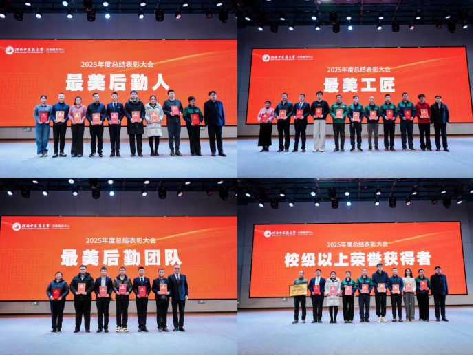 总结表彰大会在陈开馨、刘思余、刘思煜三位同学的舞蹈《青山颂》中拉开帷幕。副校长赵焕东、校工会副主席王浩然、后勤服务中心党委书记唐陆分别为受到表彰的后勤服务中心2025年度“最美后勤人”、“最美后勤团队”“最美工匠”颁奖,获奖代表发表了真挚感言,分享了在平凡岗位上的坚守与感悟。大会还对在校级以上评比中获得荣誉的先进集体与个人进行了表彰,充分体现了中心丰硕的工作成果和昂扬的团队士气。